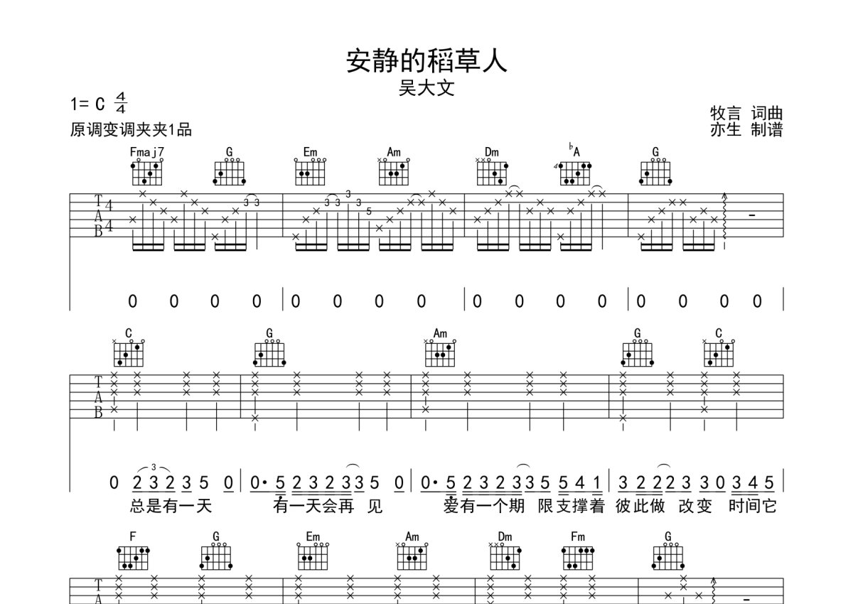 吴大文《安静的稻草人》吉他谱 - C调弹唱六线谱