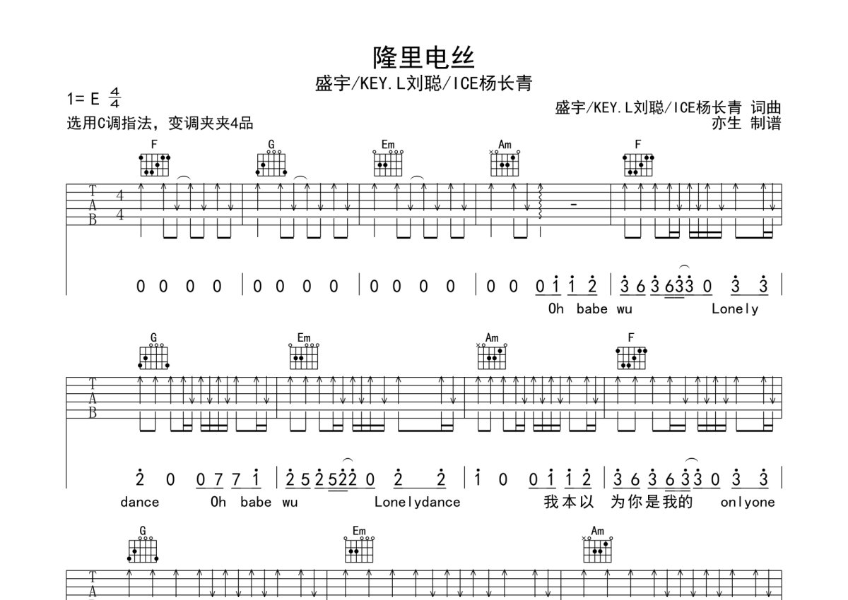 《隆里电丝》是盛宇演唱的一首歌曲,本吉他谱采用的是C调指法编配,这份吉他谱共有五张高清图谱,图谱由 @亦生 编配上传,图谱使用六线谱编配,包含吉他和弦指法、简谱以及歌词部分,使用这份隆里电丝吉他谱,可以让你更加方便地掌握这首歌曲的弹唱技巧,快来尝试吧。词谱采用C调指法,节奏4/4拍,速度110,变调夹夹4品,难度简单。
