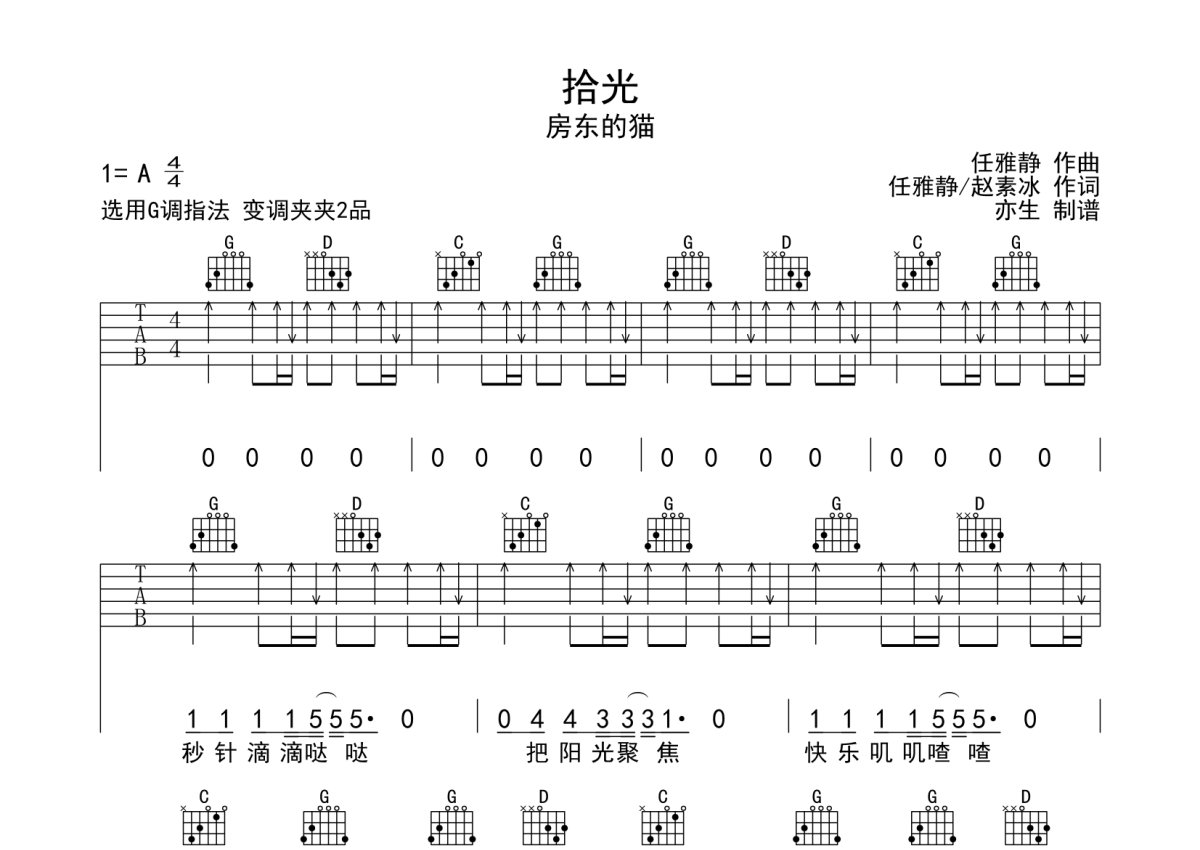房东的猫《拾光》吉他谱 - G调弹唱六线谱 - 扫弦版