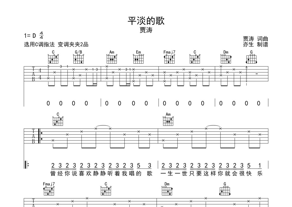 贾涛《平淡的歌》吉他谱 - C调弹唱六线谱