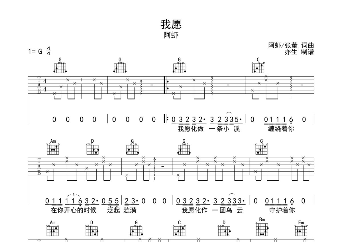 阿虾《我愿》吉他谱 - G调弹唱六线谱