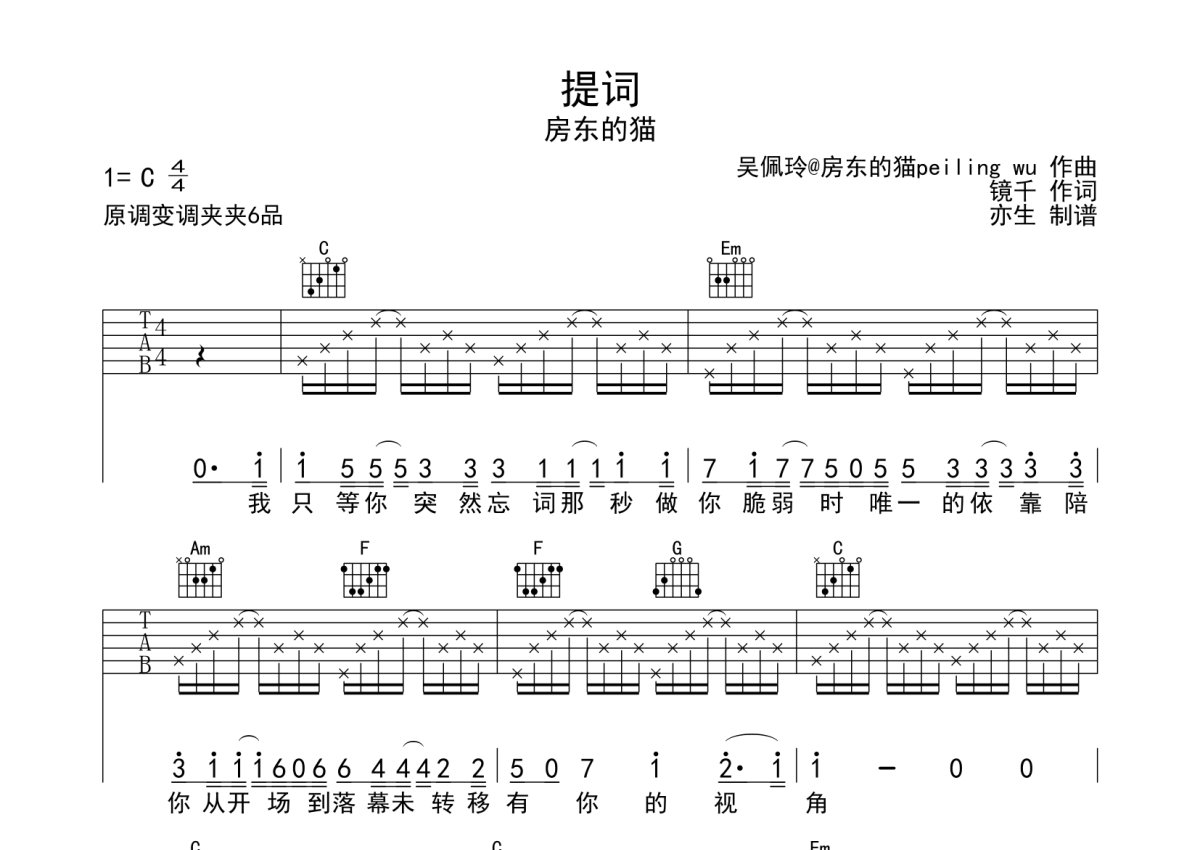房东的猫《提词》吉他谱 - C调弹唱六线谱