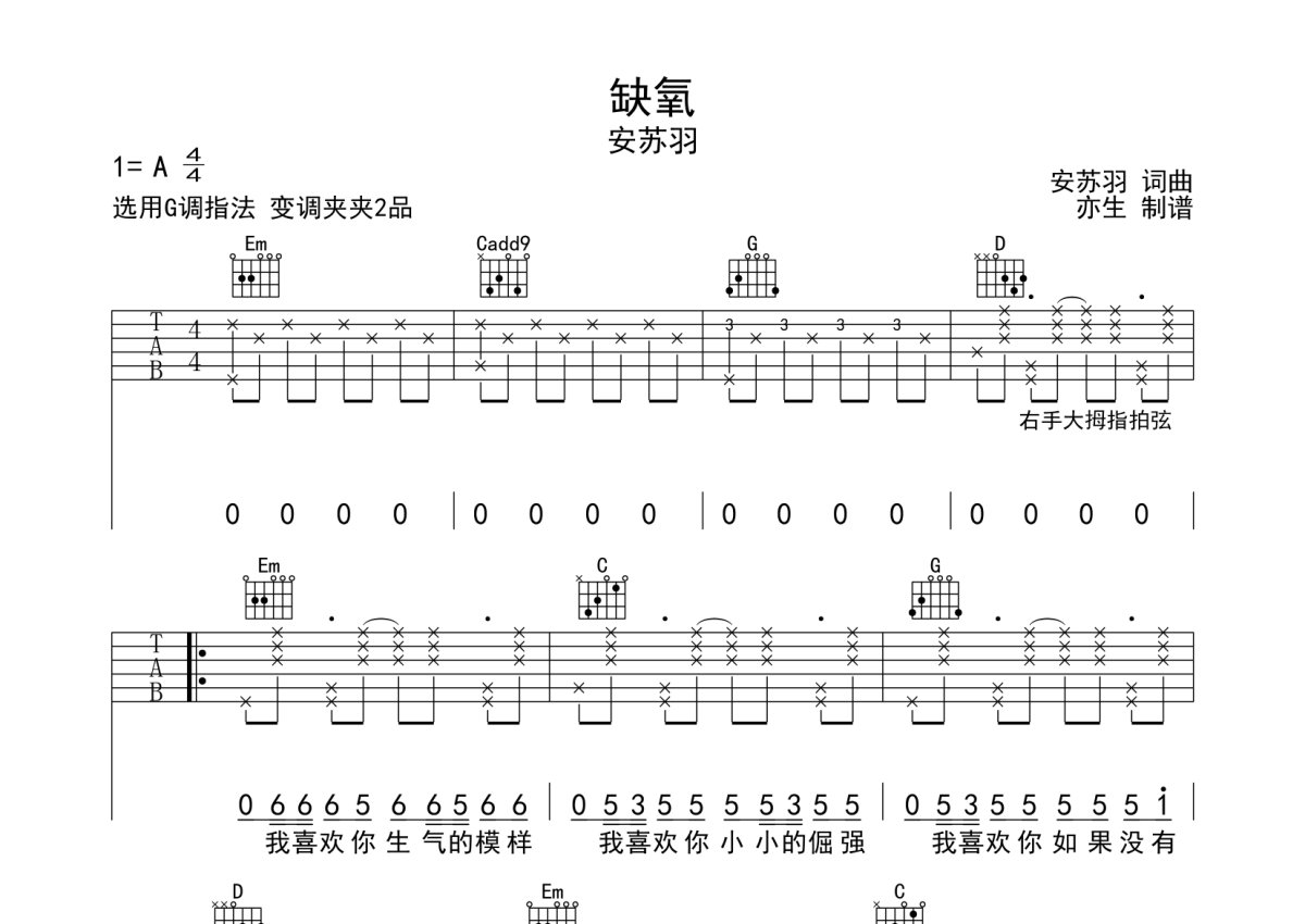 安苏羽《缺氧》吉他谱 - G调弹唱六线谱