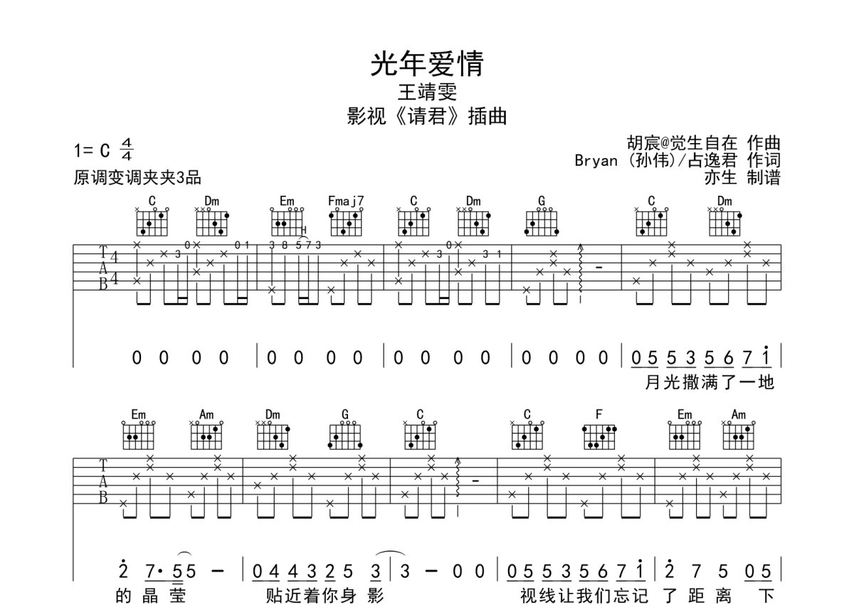 王靖雯《光年爱情》吉他谱 - C调弹唱六线谱