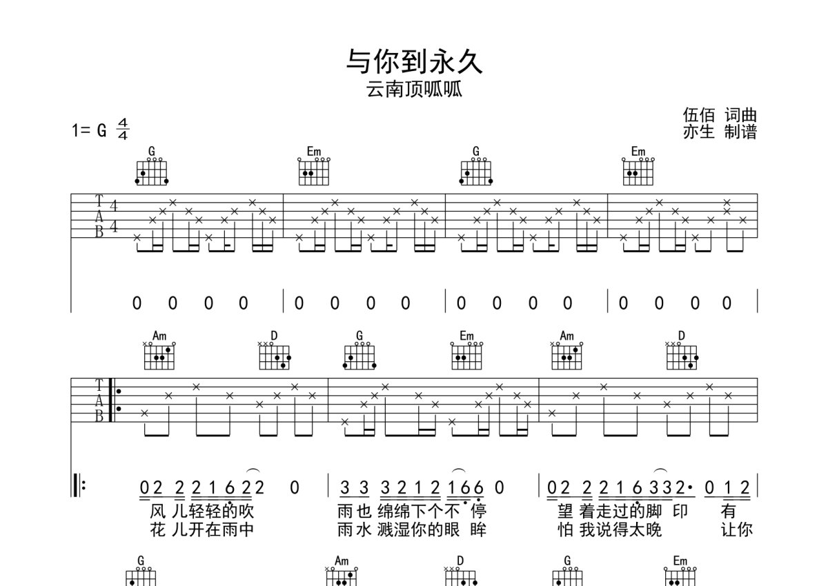 云南顶呱呱《与你到永久》吉他谱 - G调弹唱六线谱
