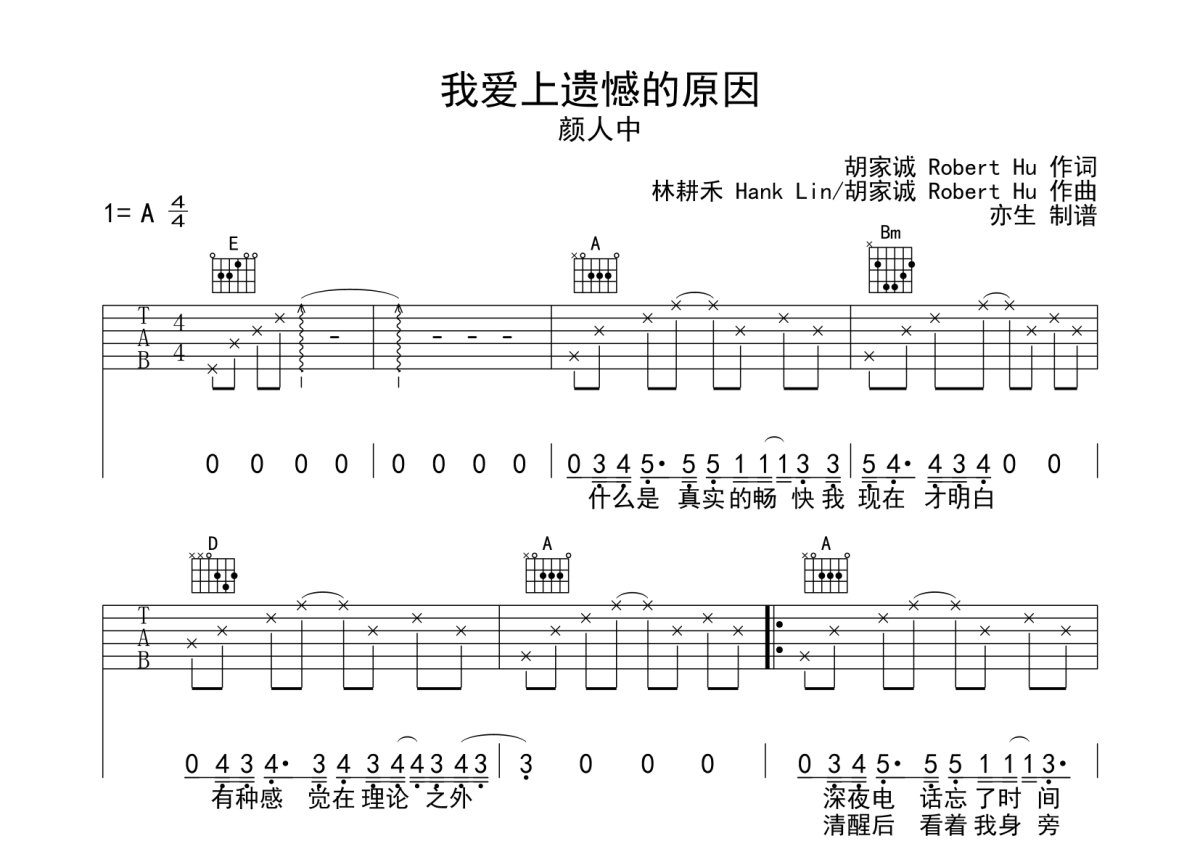 颜人中《我爱上遗憾的原因》吉他谱 - A调弹唱六线谱