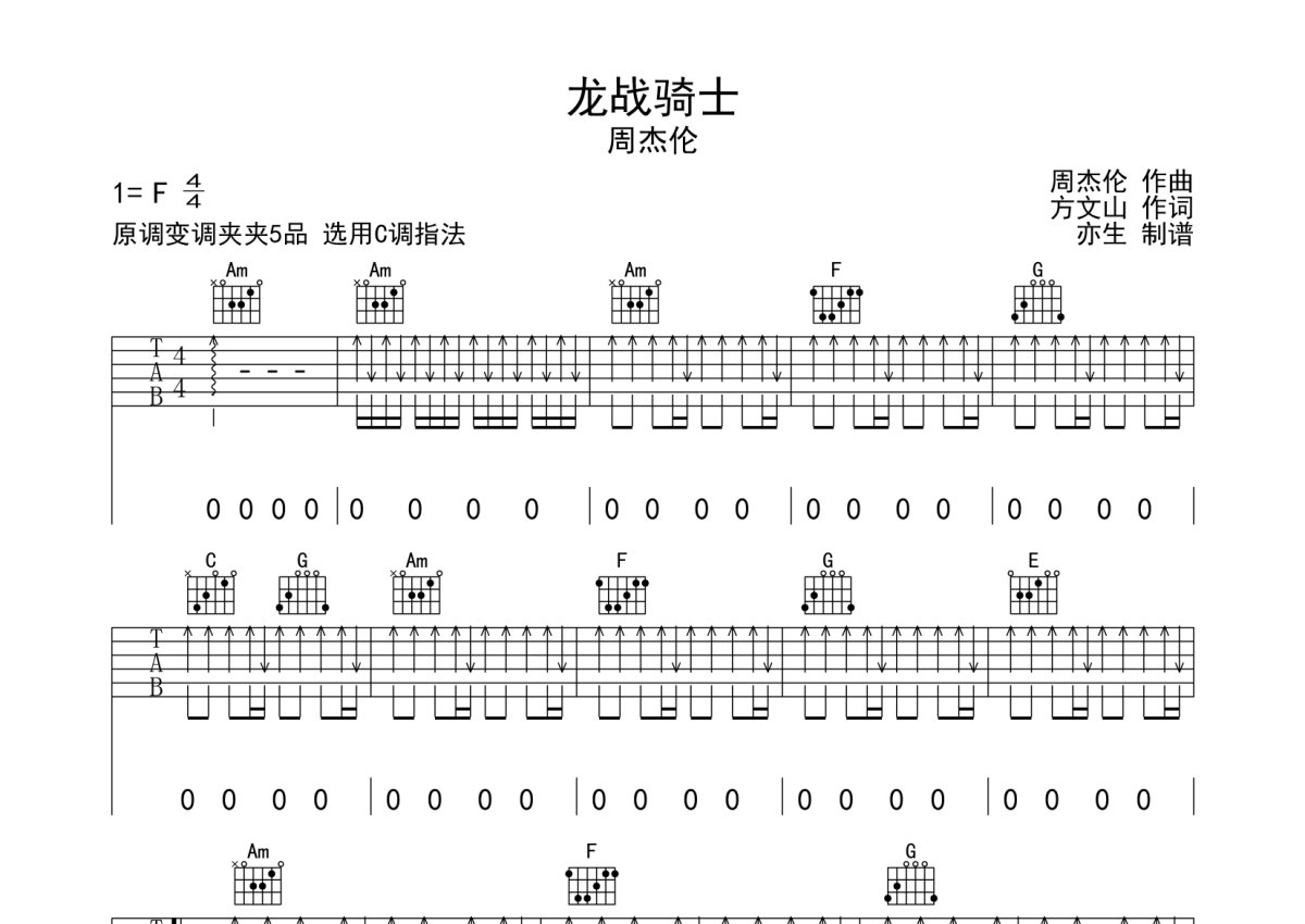 周杰伦《龙战骑士》吉他谱 - C调弹唱六线谱