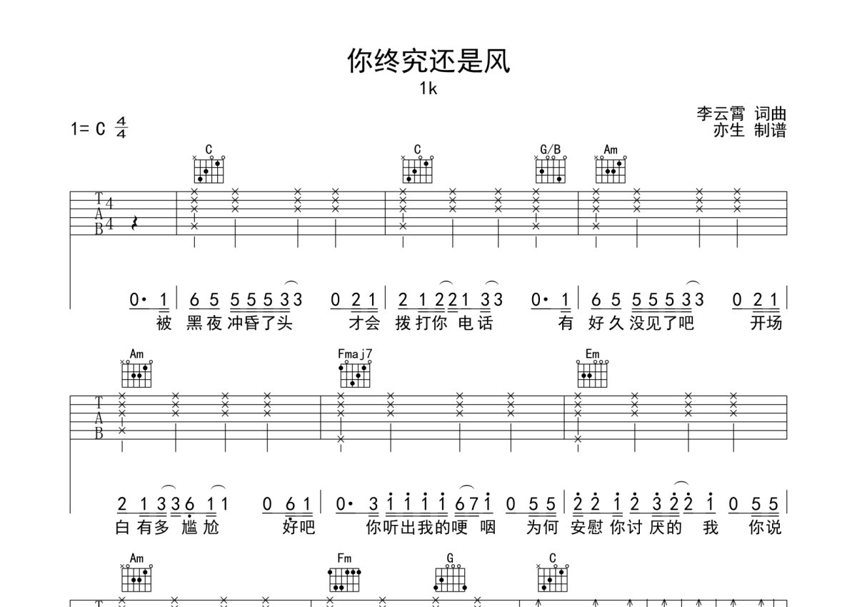 1k《你终究还是风》吉他谱 - C调弹唱六线谱