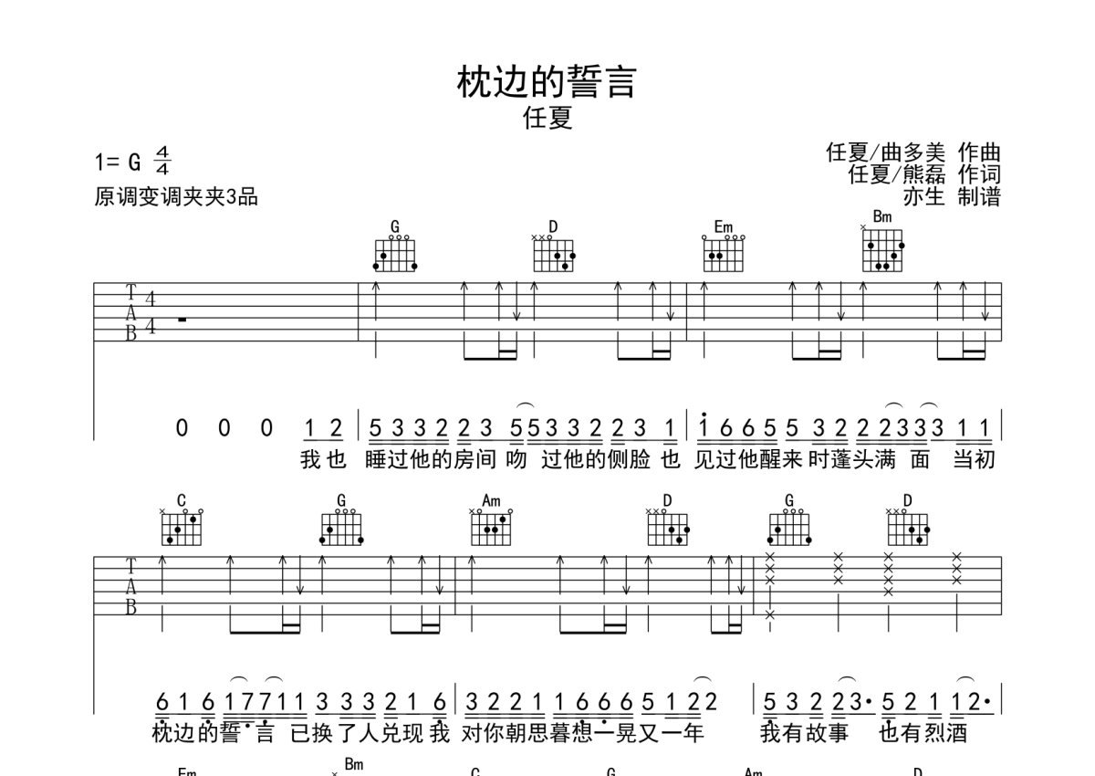 任夏《枕边的誓言》吉他谱 - G调弹唱六线谱