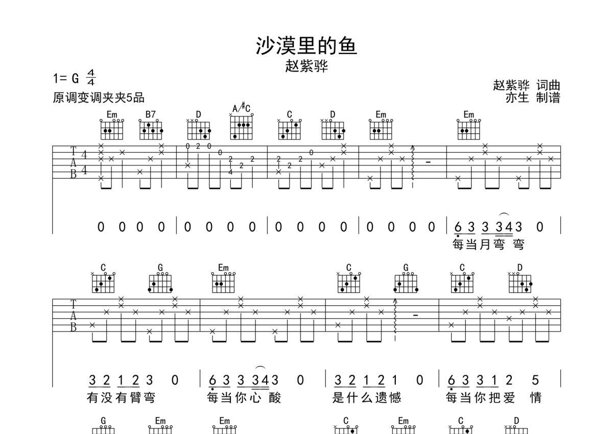 赵紫骅《沙漠里的鱼》吉他谱 - G调弹唱六线谱