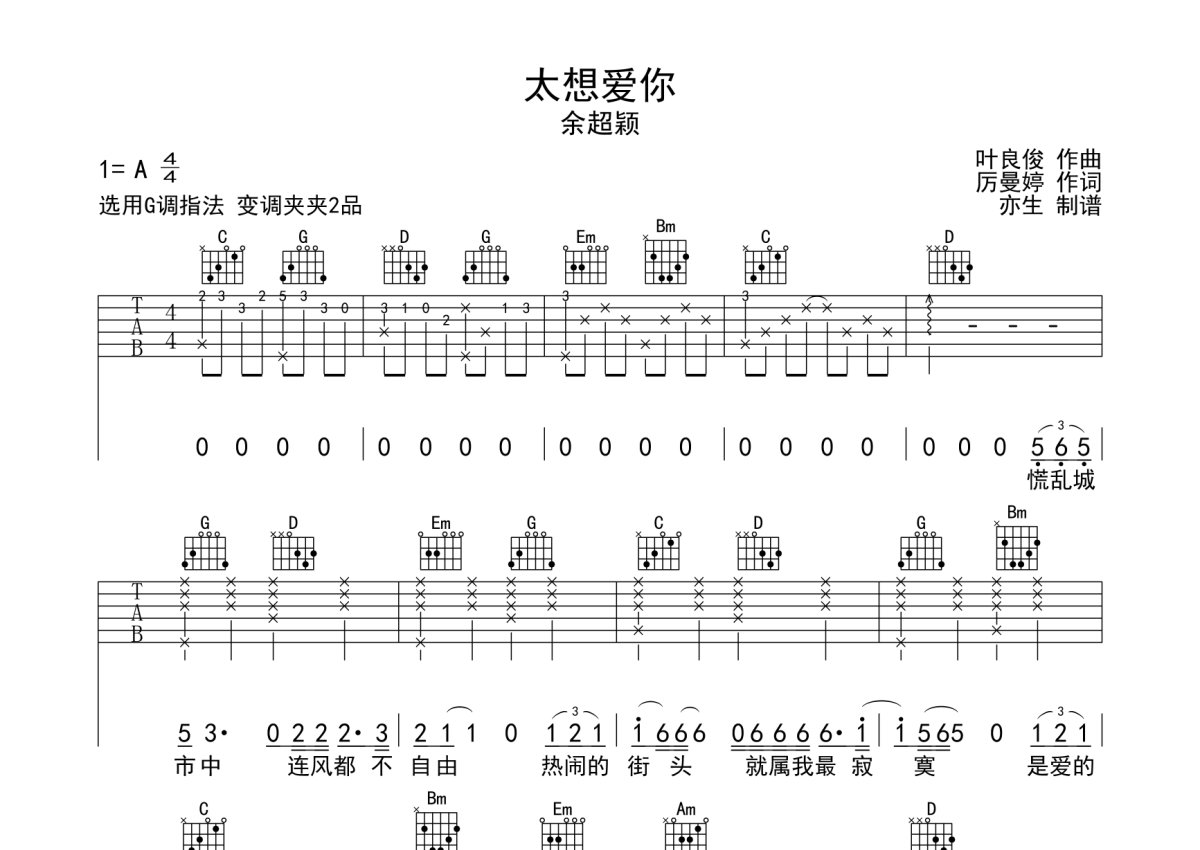 余超颖《太想爱你》吉他谱 - G调弹唱六线谱