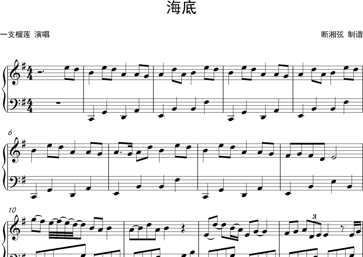 《海底》是一支榴莲演唱的一首歌曲,这份钢琴谱共有三张高清图谱,图谱由 @月隐云先知 编配上传,曲谱配备了相关的音频提供试听,使用这份海底钢琴谱,可以让你更加方便地掌握这首歌曲的演奏技巧,快来尝试吧。一支榴莲《海底》钢琴谱。
