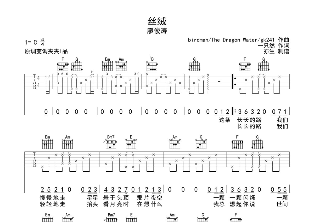廖俊涛《丝绒》吉他谱 - C调弹唱六线谱