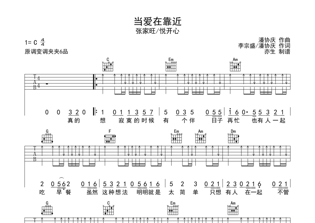 张家旺《当爱在靠近》吉他谱 - C调弹唱六线谱