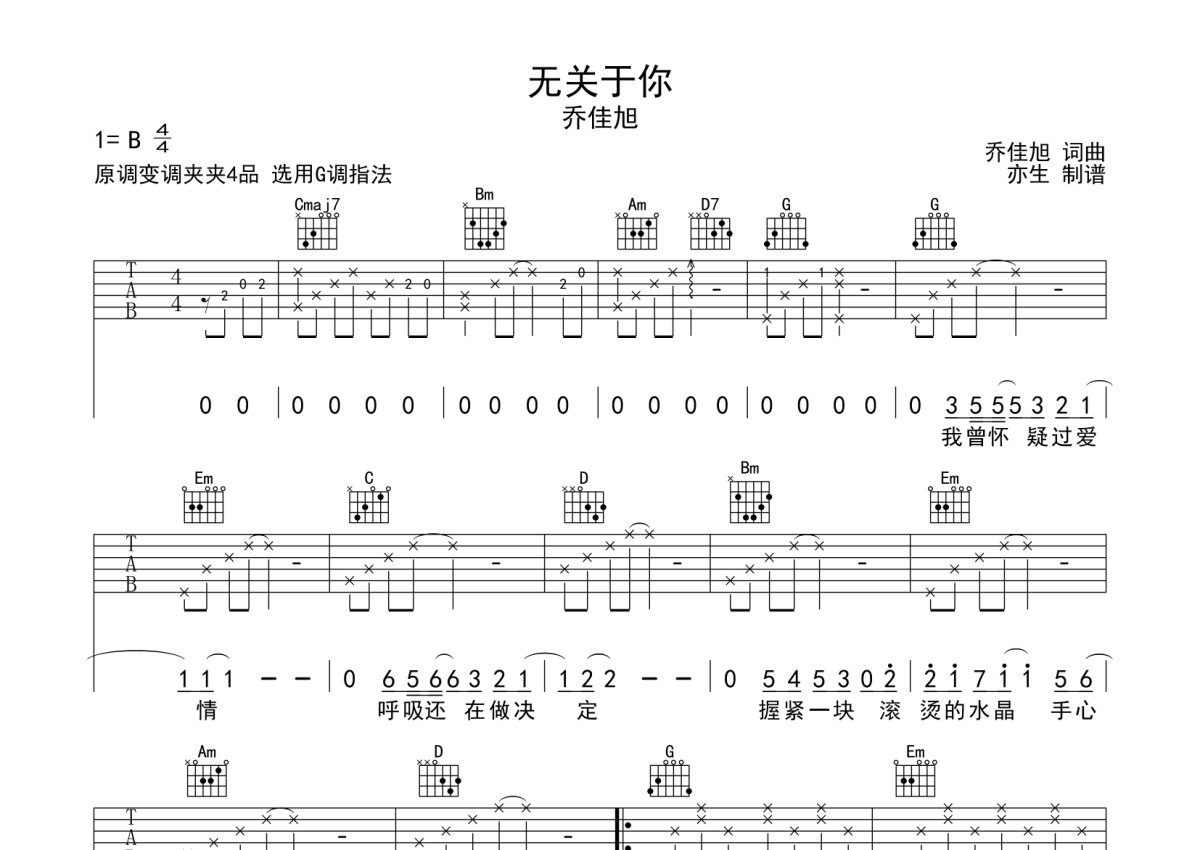 乔佳旭《无关于你》吉他谱 - G调弹唱六线谱