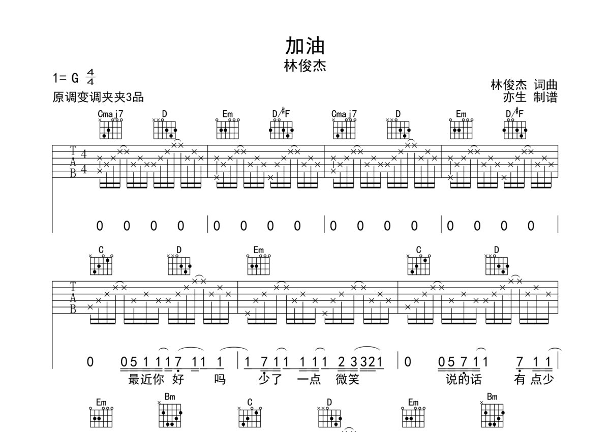 《加油》是林俊杰演唱的一首歌曲,本吉他谱采用的是G调指法编配,这份吉他谱共有三张高清图谱,图谱由 @亦生 编配上传,图谱使用六线谱编配,包含吉他和弦指法、简谱以及歌词部分,使用这份加油吉他谱,可以让你更加方便地掌握这首歌曲的弹唱技巧,快来尝试吧。林俊杰《加油》吉他弹唱谱,采用G调指法编配,亦生编配出品,共有3张高清图谱。