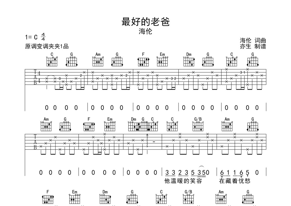 海伦《最好的老爸》吉他谱 - C调弹唱六线谱