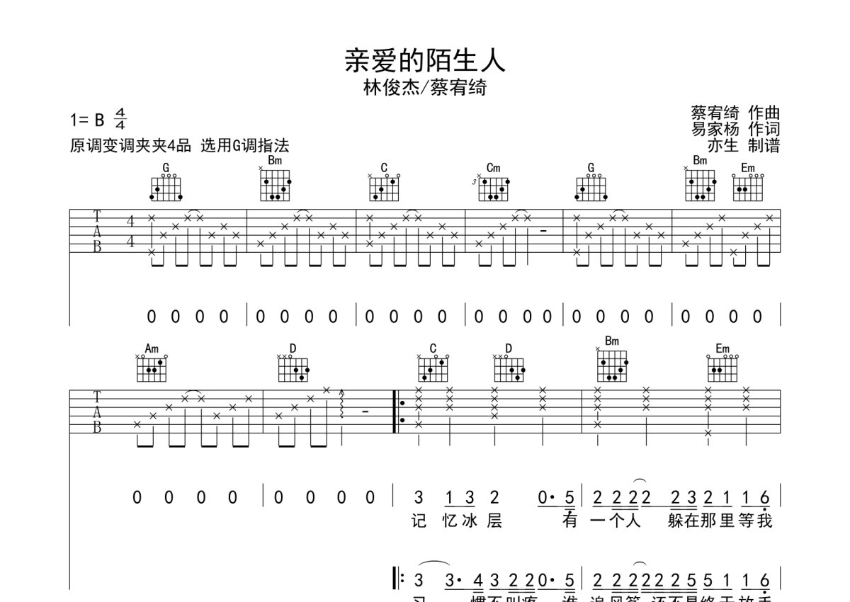 林俊杰《亲爱的陌生人》吉他谱 - G调弹唱六线谱