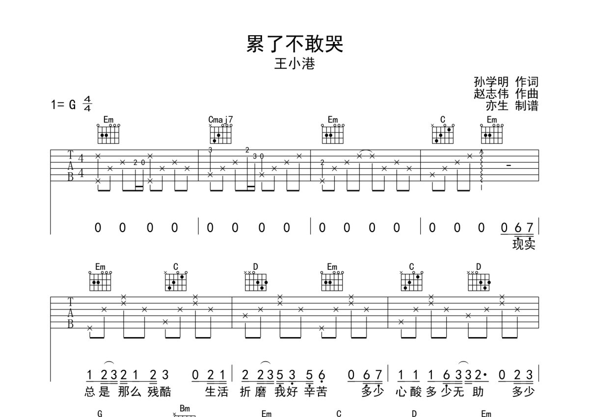 王小港《累了不敢哭》吉他谱 - G调弹唱六线谱