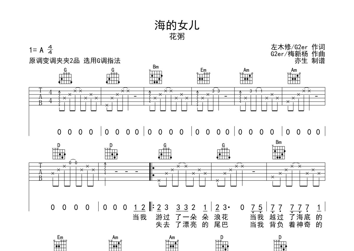 花粥《海的女儿》吉他谱 - G调弹唱六线谱