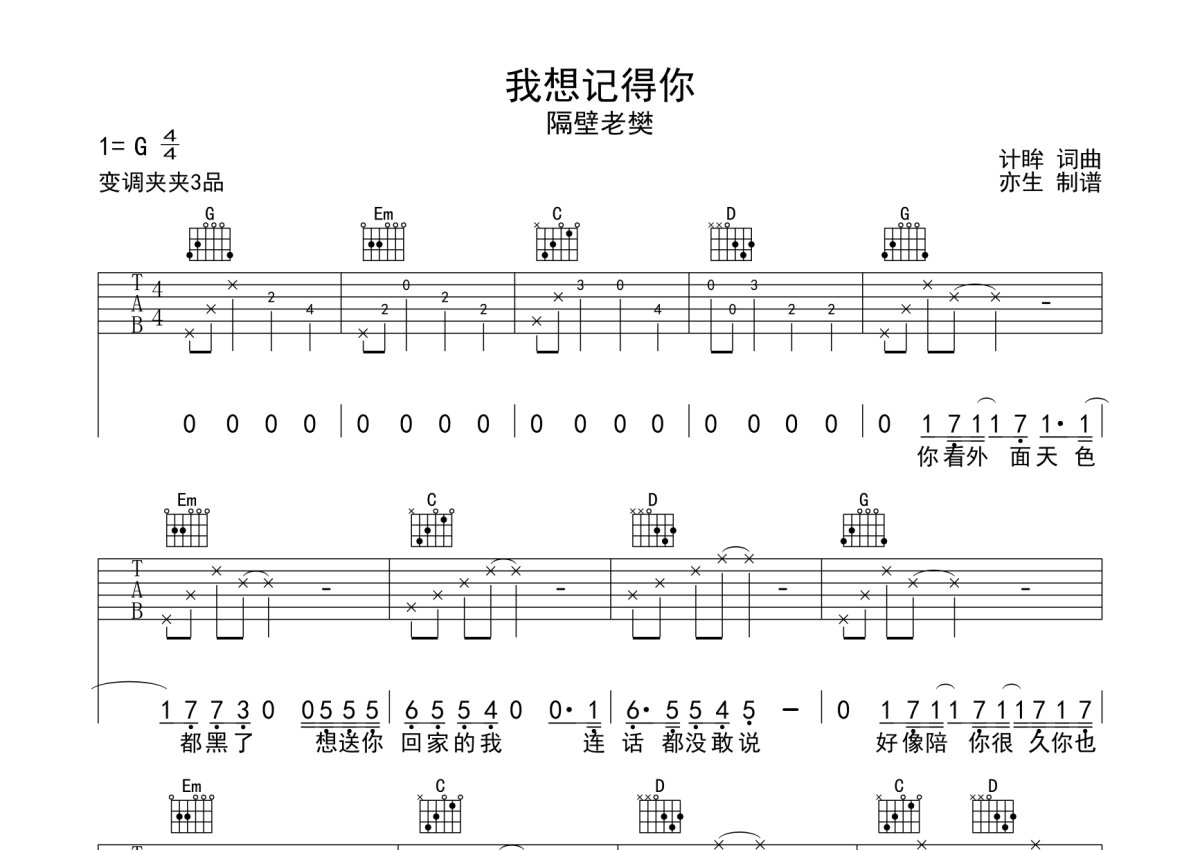 隔壁老樊《我想记得你》吉他谱 - G调弹唱六线谱