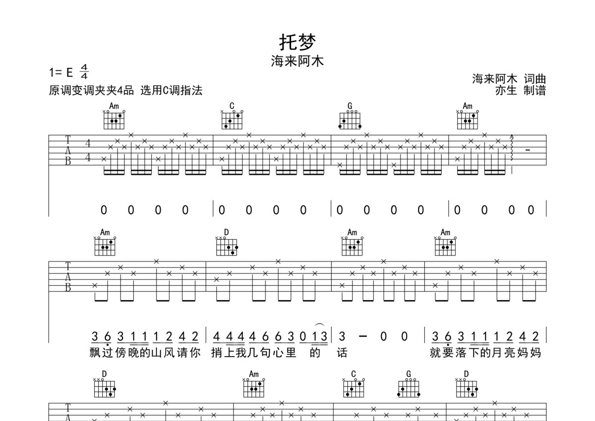 《托梦》是海来阿木演唱的一首歌曲,本吉他谱采用的是C调指法编配,这份吉他谱共有三张高清图谱,图谱由 @亦生 编配上传,图谱使用六线谱编配,包含吉他和弦指法、简谱以及歌词部分,使用这份托梦吉他谱,可以让你更加方便地掌握这首歌曲的弹唱技巧,快来尝试吧。此谱采用C调和弦指法演奏,推荐变调夹夹第4品,节奏4/4拍,演奏速度大约每分钟95拍,演奏难度为简单。