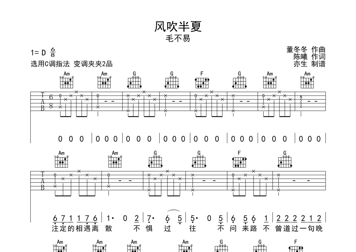 毛不易《风吹半夏》吉他谱 - C调弹唱六线谱