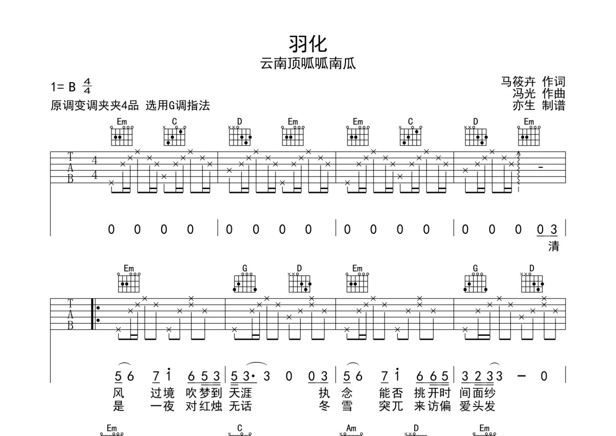 云南顶呱呱南瓜《羽化》吉他谱 - G调弹唱六线谱