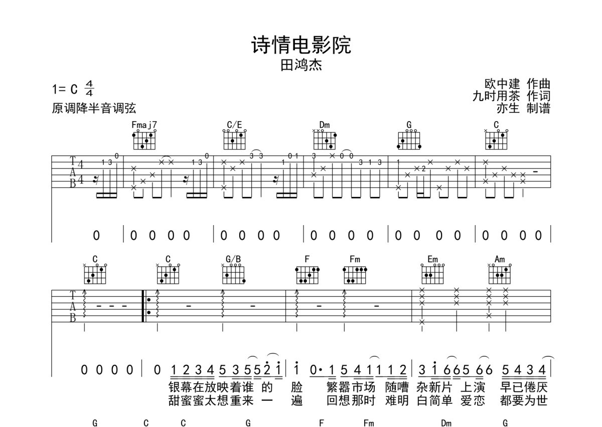 田鸿杰《诗情电影院》吉他谱 - C调弹唱六线谱