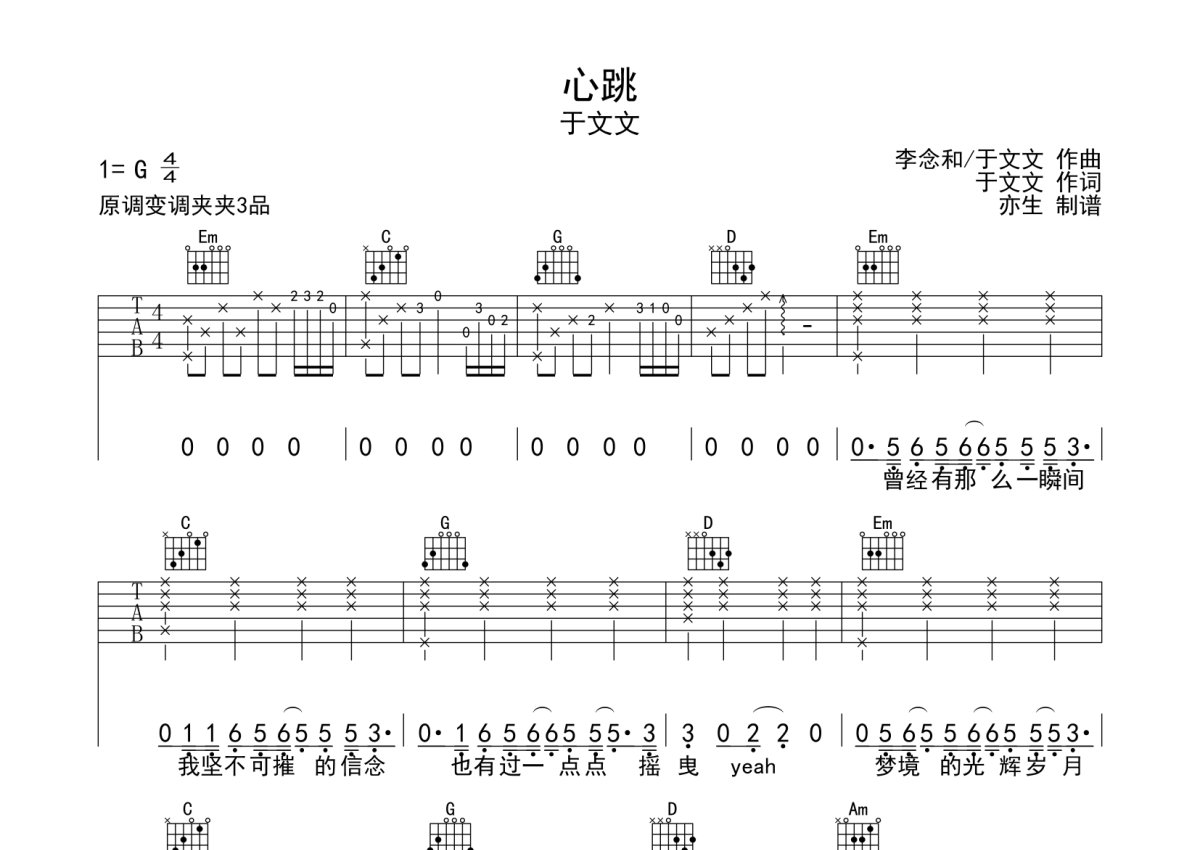 于文文《心跳》吉他谱 - G调弹唱六线谱