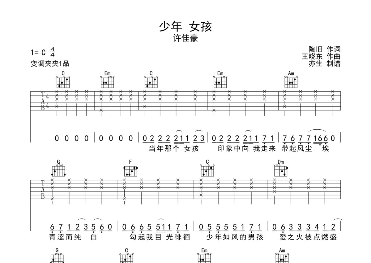 许佳豪《少年 女孩》吉他谱 - C调弹唱六线谱