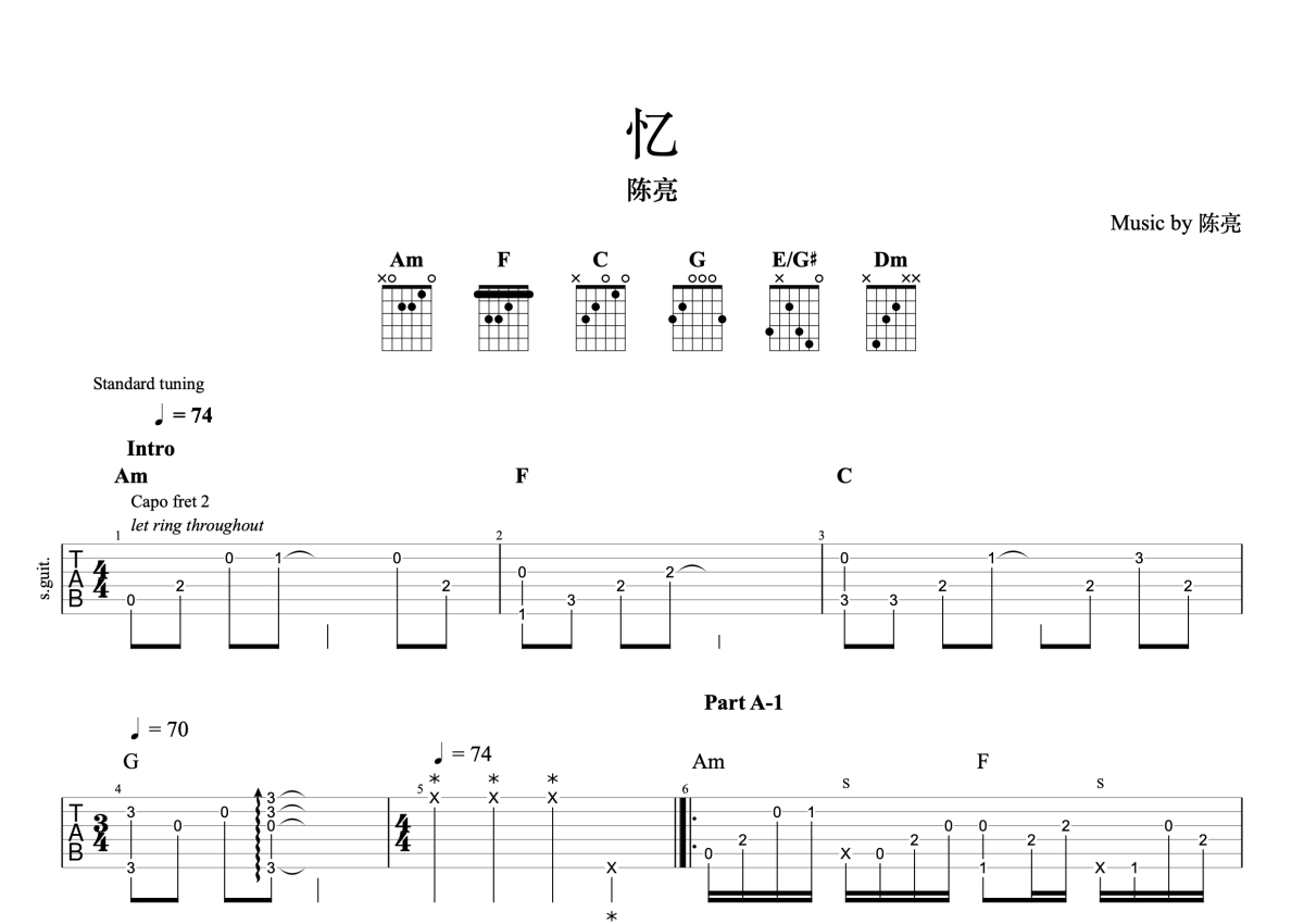 陈亮《忆》吉他谱 - C调独奏六线谱 - 标准调弦完整编配版