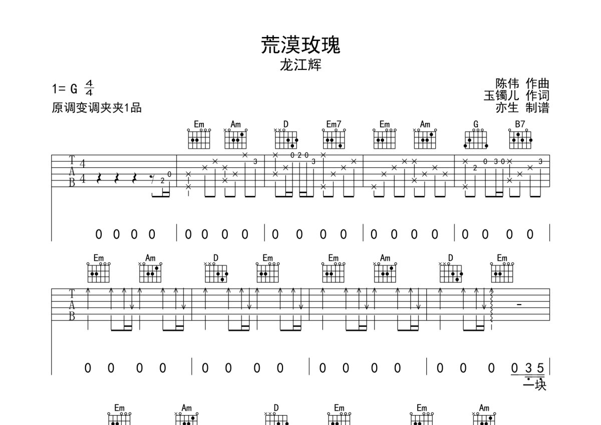 龙江辉《荒漠玫瑰》吉他谱 - G调弹唱六线谱