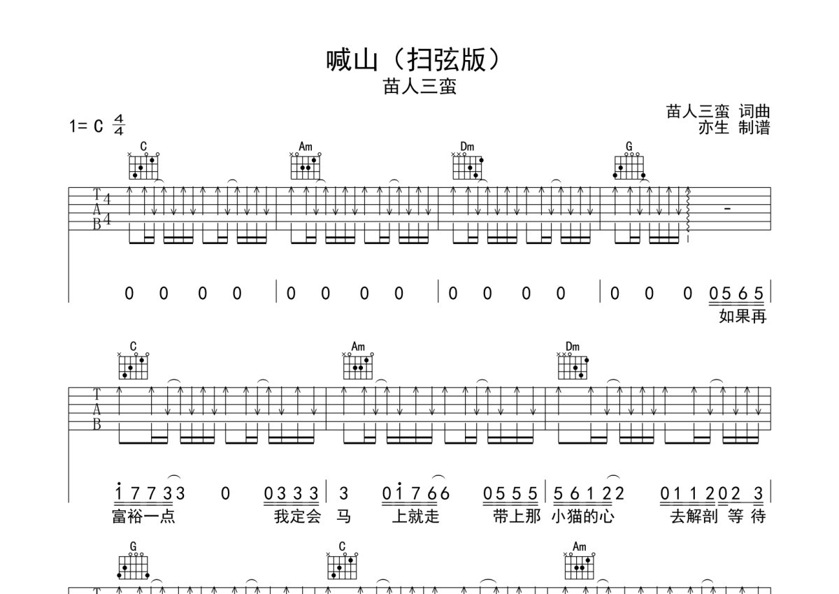 苗人三蛮《喊山》吉他谱 - C调弹唱六线谱 - 扫弦版