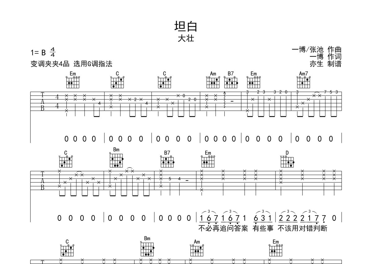 大壮《坦白》吉他谱 - G调弹唱六线谱