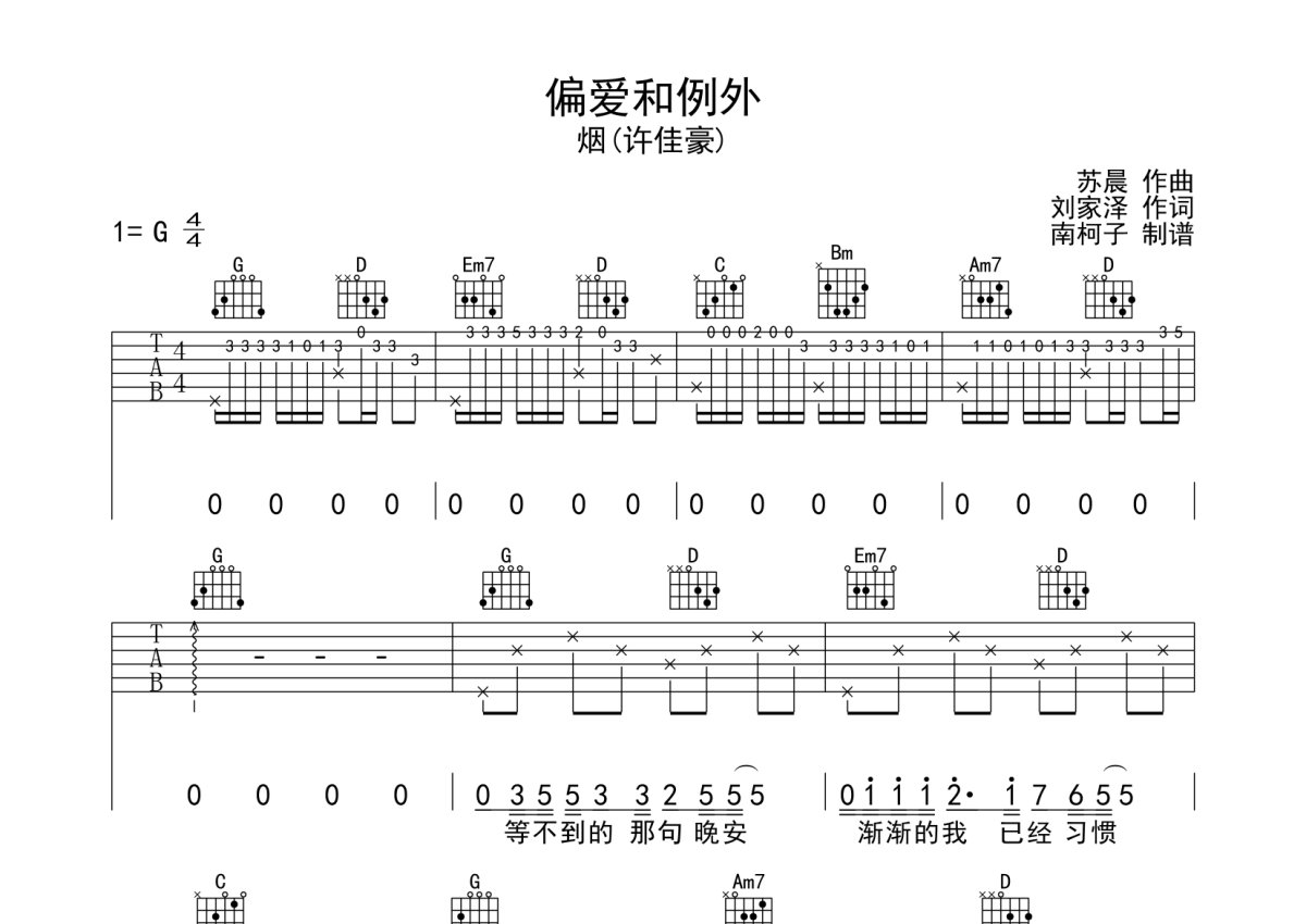 烟/许佳豪《偏爱和例外》吉他谱 - G调弹唱六线谱