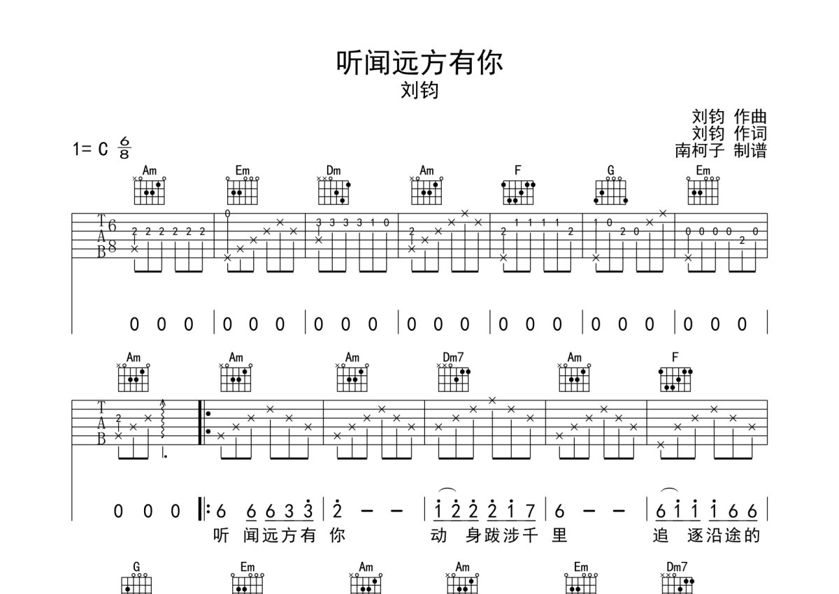 刘钧《听闻远方有你》吉他谱 - C调弹唱六线谱