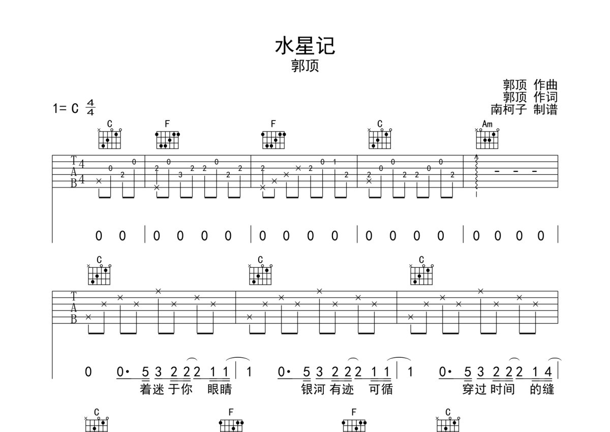 郭顶《水星记》吉他谱 - C调弹唱六线谱