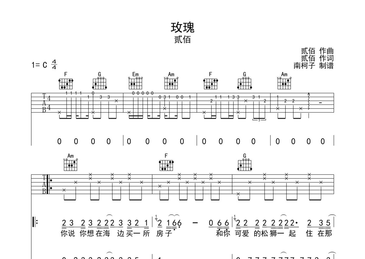 贰佰《玫瑰》吉他谱 - C调弹唱六线谱