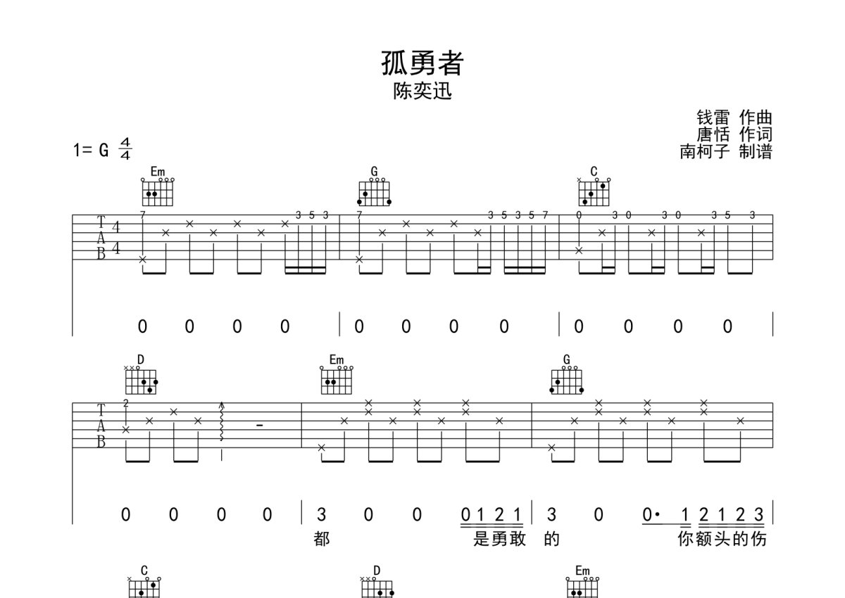陈奕迅《孤勇者》吉他谱 - G调弹唱六线谱