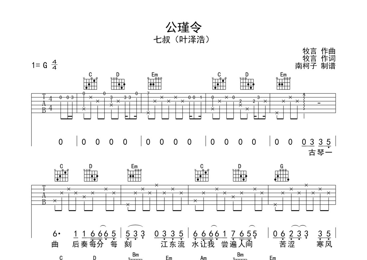 七叔/叶泽浩《公瑾令》吉他谱 - G调弹唱六线谱