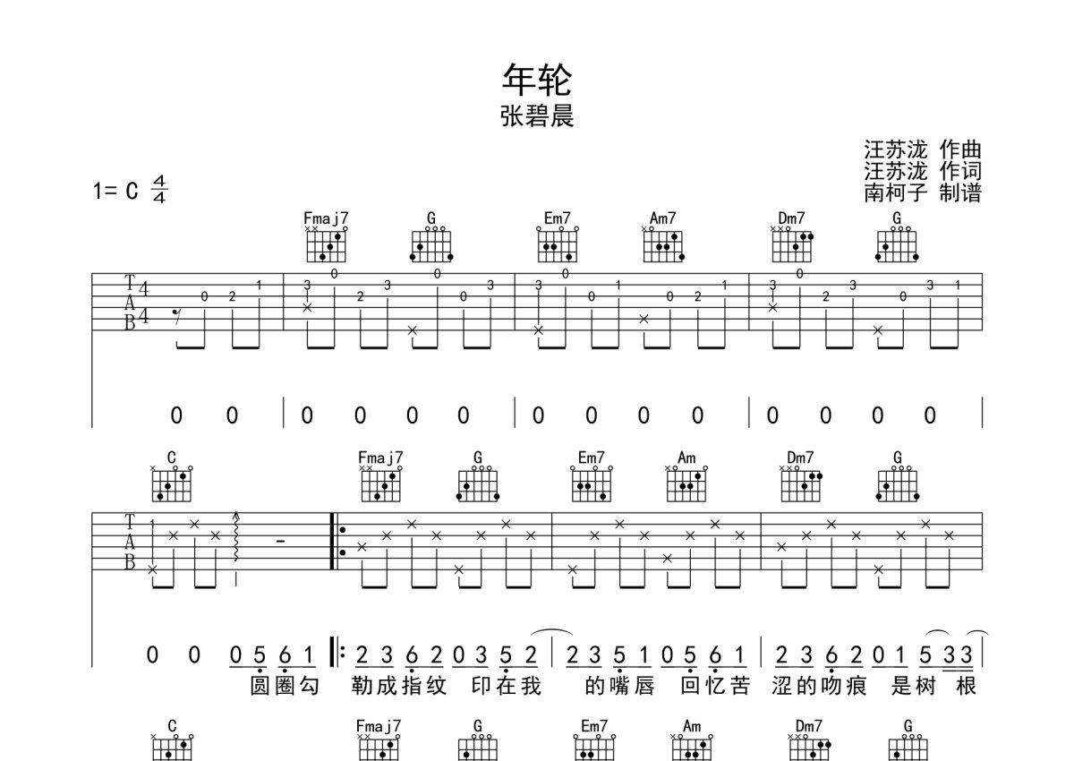 张碧晨《年轮》吉他谱 - C调弹唱六线谱