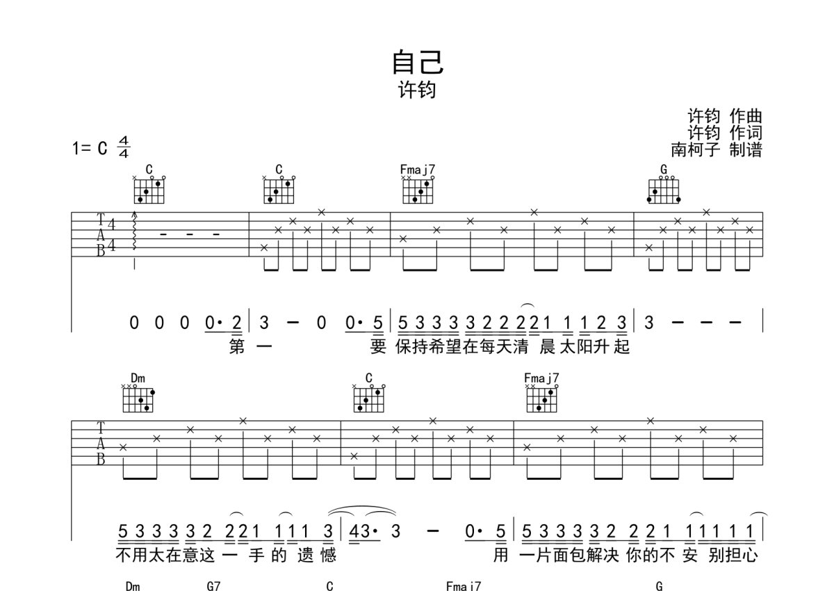 许钧《自己》吉他谱 - C调弹唱六线谱