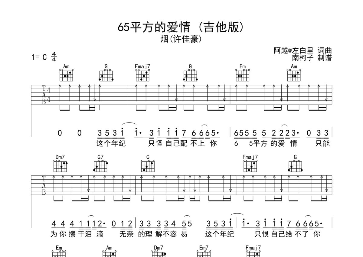 烟(许佳豪)《65平方的爱情》吉他谱 - C调弹唱六线谱 - 吉他版