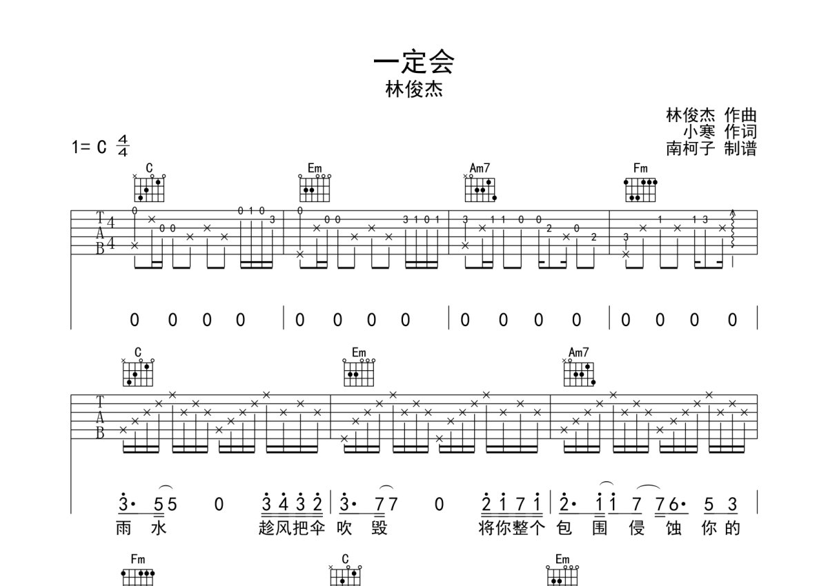 林俊杰《一定会》吉他谱 - C调弹唱六线谱