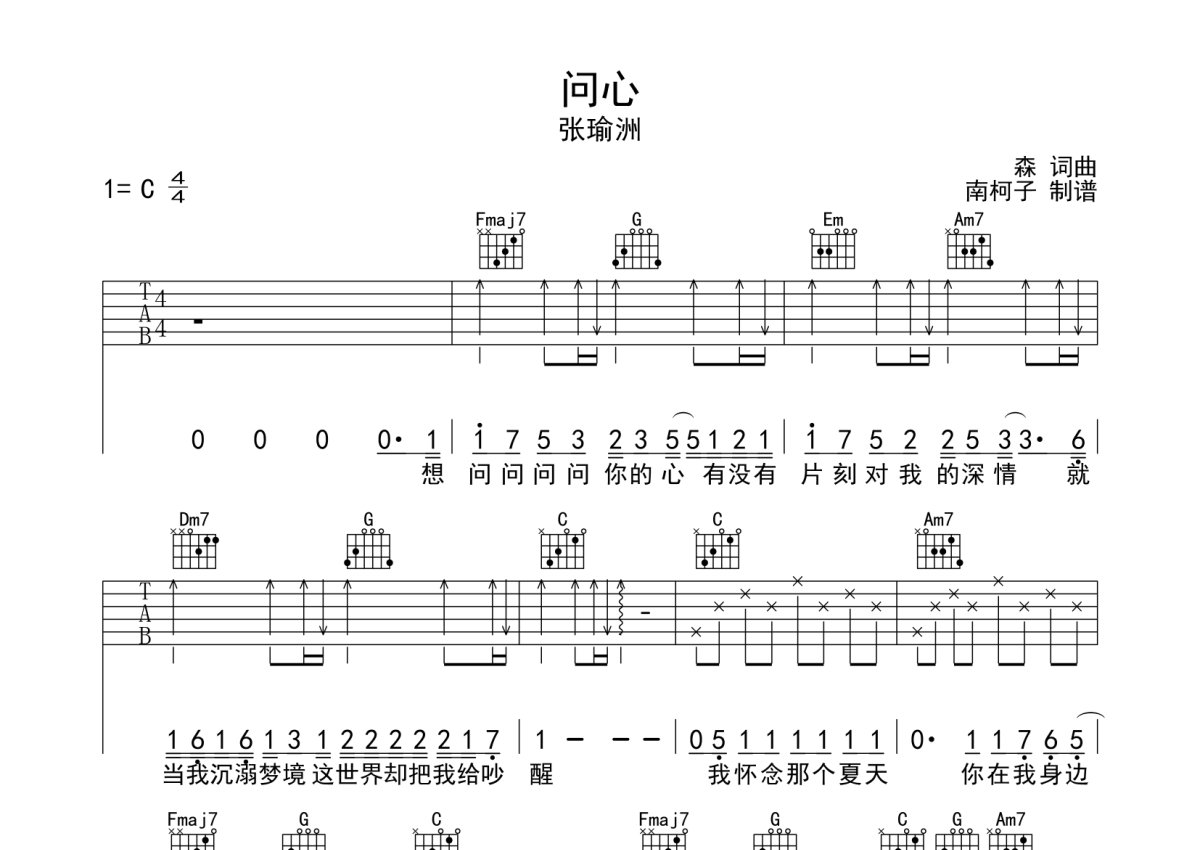 张瑜洲《问心》吉他谱 - C调弹唱六线谱