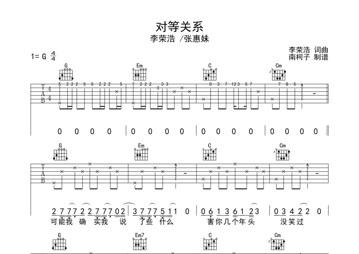李荣浩 /张惠妹《对等关系》吉他谱 - G调弹唱六线谱