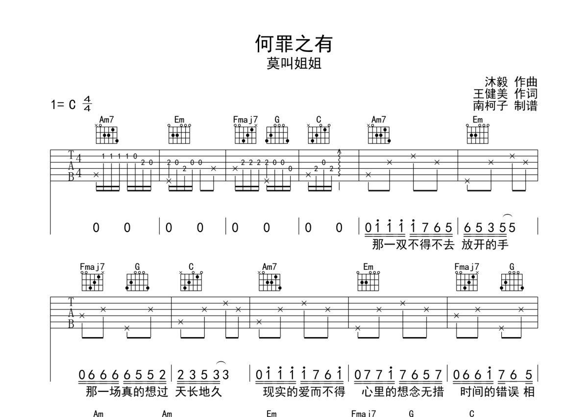 莫叫姐姐《何罪之有》吉他谱 - C调弹唱六线谱
