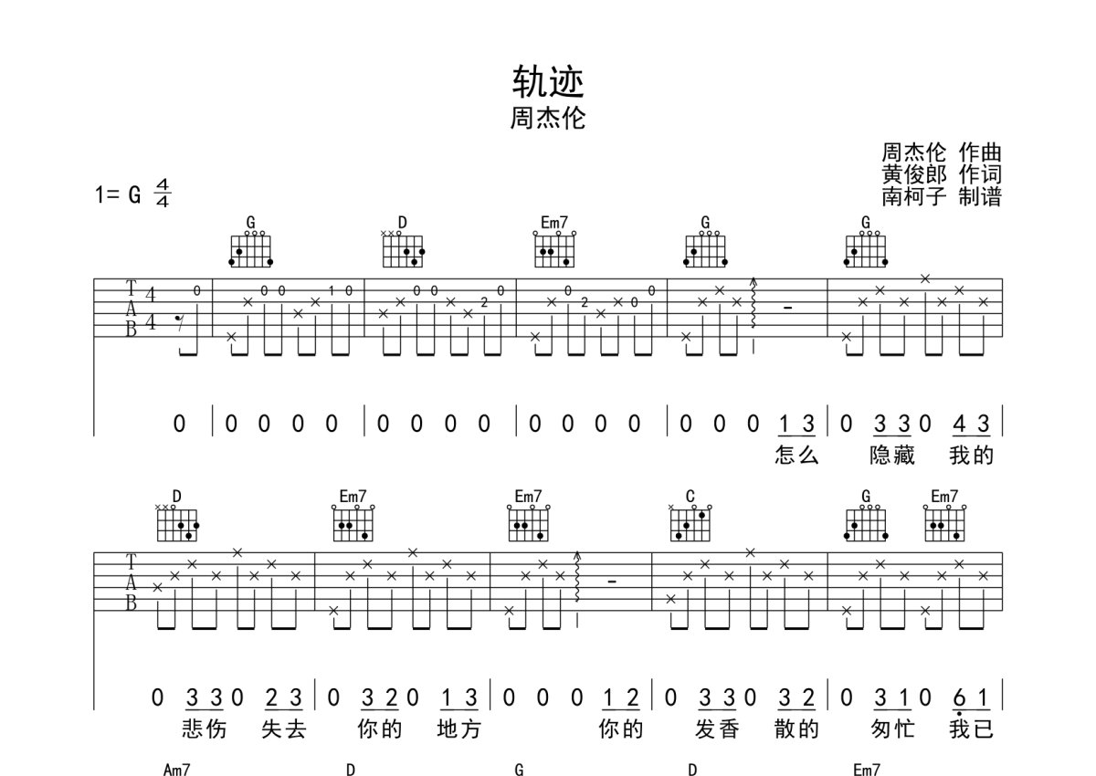 周杰伦《轨迹》吉他谱 - G调弹唱六线谱