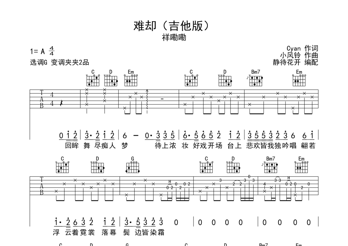 《难却》是祥嘞嘞演唱的一首歌曲,本吉他谱采用的是G调指法编配,这份吉他谱共有两张高清图谱,图谱由 @静待花开 编配上传,图谱使用六线谱编配,包含吉他和弦指法、简谱以及歌词部分,使用这份难却吉他谱,可以让你更加方便地掌握这首歌曲的弹唱技巧,快来尝试吧。来自@静待花开编配吉他谱,采用G调和弦指法演奏,推荐变调夹夹第2品,原调A调,也可以根据个人嗓音灵活选择变调夹位置,演奏速度大约每分钟85拍,演奏难度简单。